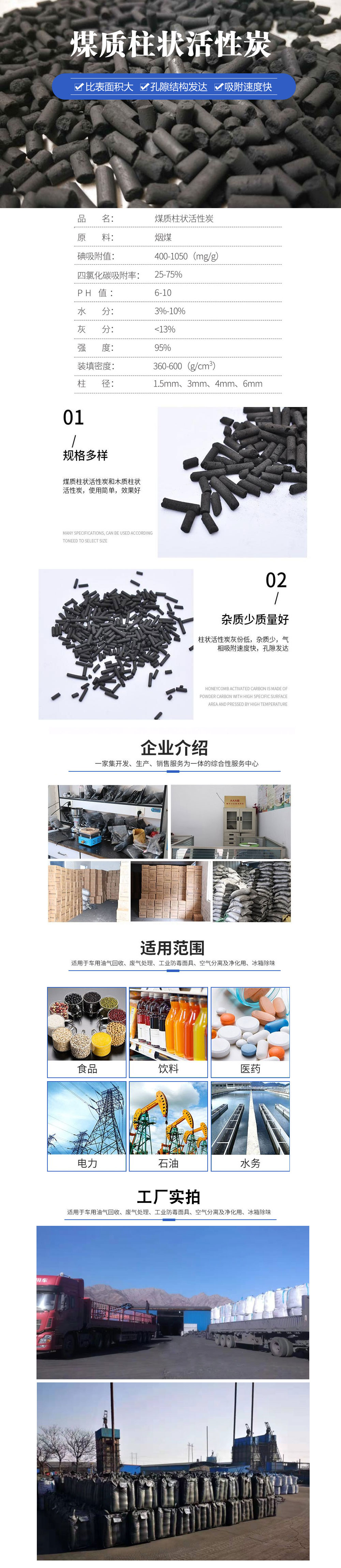 柱狀活性炭是以煤炭為原料、以煤油為粘合劑、經(jīng)磨粉、混配、擠壓成形、炭化、活化而成的圓柱形活性炭。該產(chǎn)品比表面積大、孔隙發(fā)達(dá)、強(qiáng)度高、吸附能力強(qiáng)、化學(xué)穩(wěn)定性好、可廣泛應(yīng)用于化工、制藥、食品等各種氣體的有害有毒及微生物凈化過(guò)濾、對(duì)低拂點(diǎn)的苯類、醇類、四氯化碳、三氯甲烷等有害氣體有很好的吸附作用,活性炭吸